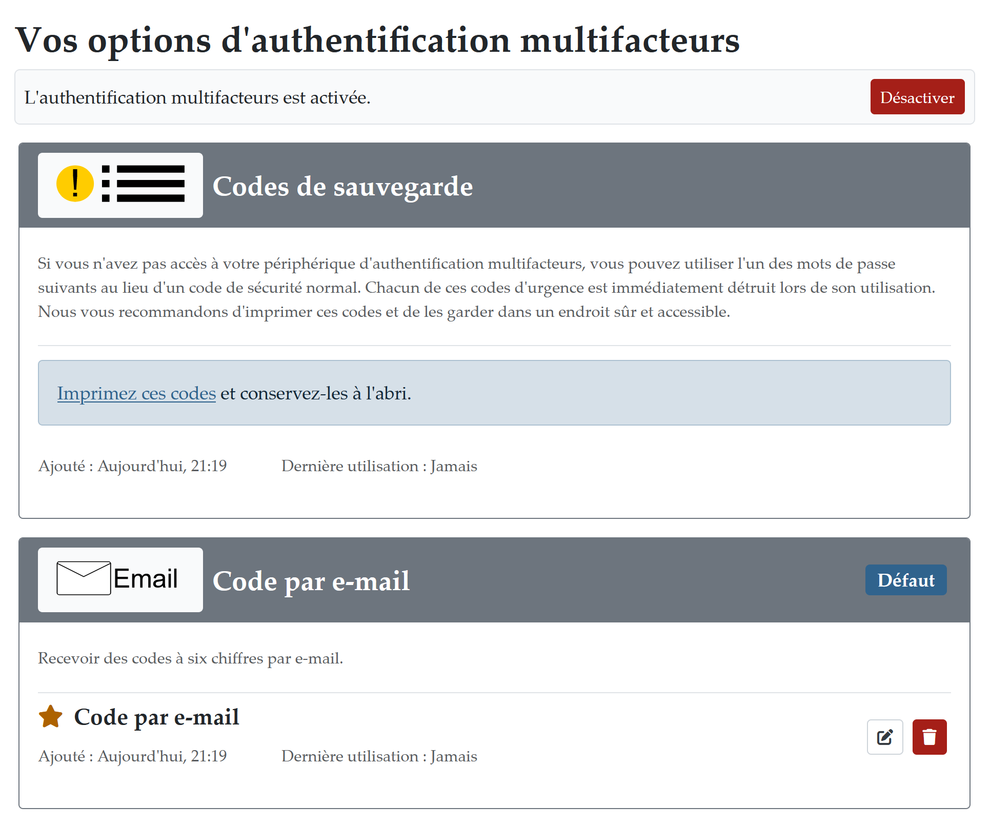 Tu arrives enfin sur la dernière page de confirmation que le mode d'authentification par mail est paramétré.